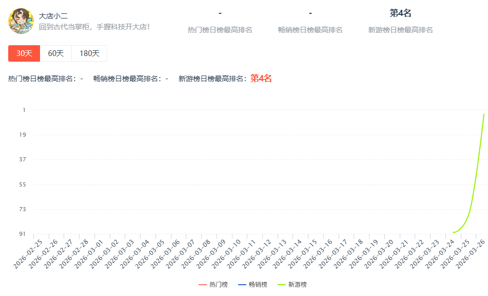 与此同时,《大店小二》同步登陆微信小游戏、抖音小游戏平台,目前暂未进入双平台畅销榜。但在3月24日上线当日,游戏冲入抖音小游戏新游榜第 90名,3月26日大幅攀升至第4名。