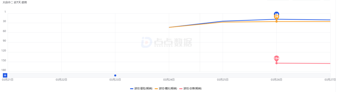 而在畅销榜维度,《大店小二》上线首日并未进入iOS畅销榜总榜,仅登顶冒险、模拟两大品类榜单第44位。直至3月26日,游戏成功跻身iOS畅销榜总榜,位列第154名;冒险、模拟细分榜单排名同步上涨,分别达到第19 名、第26名。