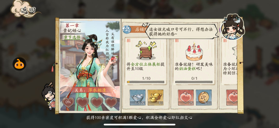 养成体系方面,游戏有“门客”系统,同时增设人物养成、内宅经营双线玩法。玩家推进主线剧情即可提升与女主“杨小环”的好感度,解锁结缘剧情与专属宅邸,给予玩家情感陪伴长线体验与深度经营目标。